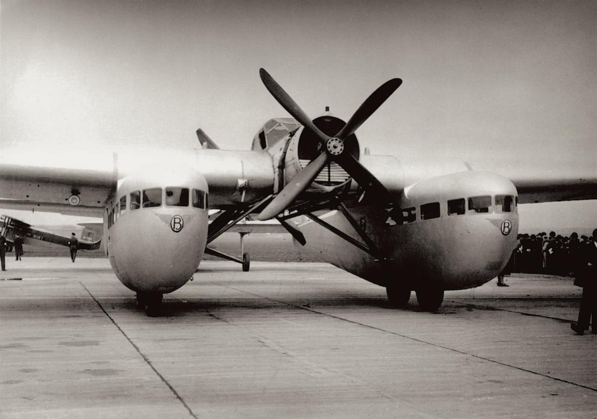 Each of the twin booms seated six passengers, with wide windows a’plenty. A central fuselage contained the flight deck, occupied by pilot, copilot, and navigator, and twin Hispano-Suiza 12Hbr engines, one operating in tractor fashion, the other as a pusher.