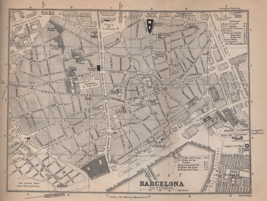 Barcelona. Murray’s Hand-Book to the Mediterranean Part II, 1892, says “Barcelona is the chief city in the district or principality of Cataluňa, which, for industry and entereprise, is second to none other in Spain. It became part of the kingdom of Spain when Ferdinand of Aragon espoused Isabel of Castile, and here it was that they received Christopher Columbus after his discovery of the New World.”