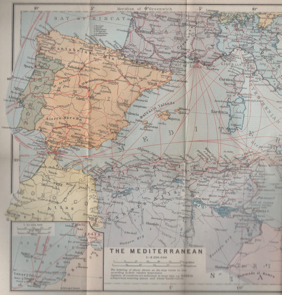 Northward and Easterly. Traveling north from Barcelona, we pass into France, bend eastward around what Baedeker’s calls the Gulf of Lions, and head for Marseilles. Ready for some bouillabaisse tomorrow in Part 2? ds