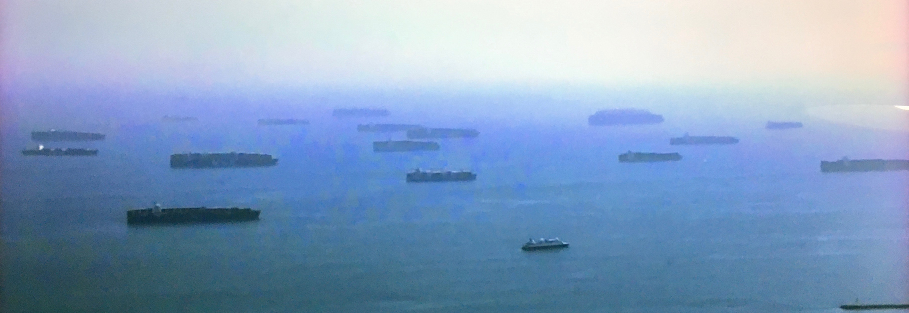 Port congestion has been a significant challenge, only partially met by a shift toward 24/7 operation and optimized turnaround of the containers once emptied. Yet, it turns out the 35 container ships I counted were only part of the shipping fleet queued up waiting for dock space.