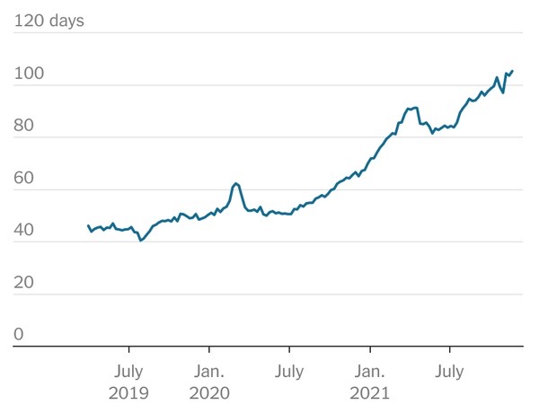 “As of last week,” DealBook continues, “it took an average of 105 days to ship goods to the U.S. from China, up from 84 in early July and 50 prepandemic. ‘Every time you interrupt the flow,’ said Phil Levy, Flexport’s chief economist, ‘you add to the backup.’ ”