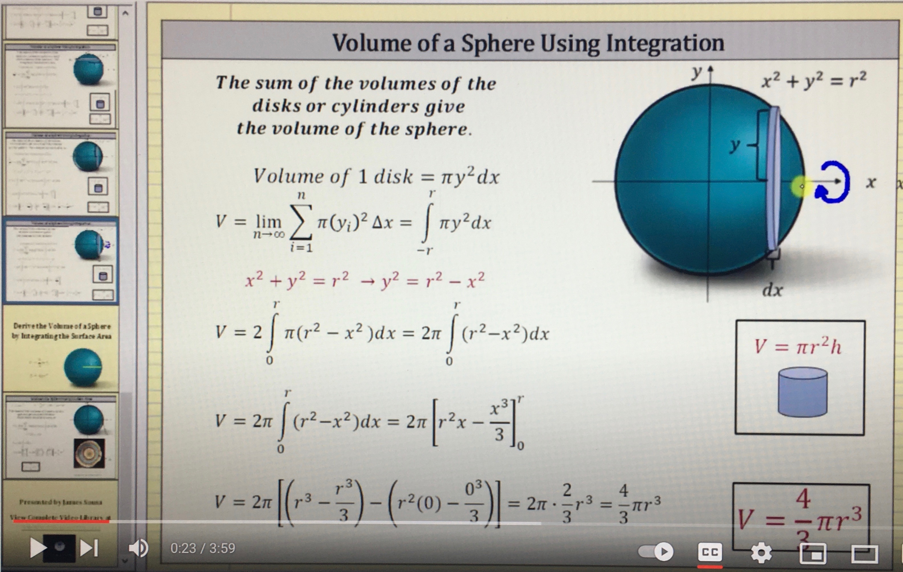 It’s a wonderful calculus application of integration, of summing up a bunch of thin slices to determine a volume.
