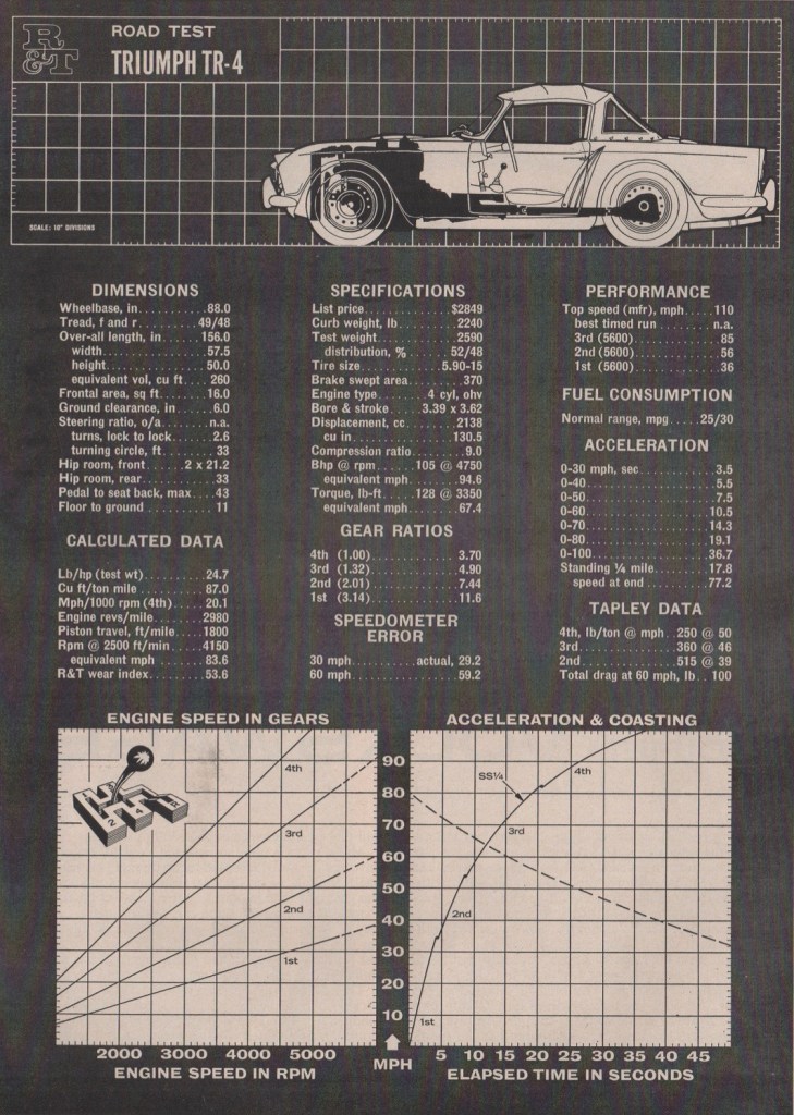 R&T’s Conclusion. “The TR-4 offers excellent performance at a moderate initial cost and a sporting driver would search for a long time to beat the combination. And, in spite of our criticisms of the car…. we think Standard-Triumph has a real winner here, if production can keep up with demand.” ds