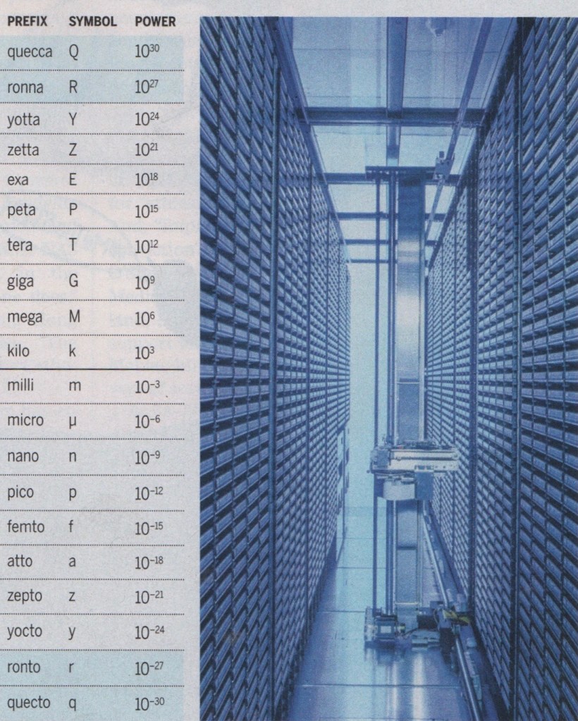 The Six Giants: Kilo, Mega, Giga, Tera, Peta, and Exa. Our computers have made kiddy stuff of the kilo (103). As noted here at SimanaitisSqys, my Apple iMac operates at 3.2 GHz, with 1.0-terabytes of disc storage.
