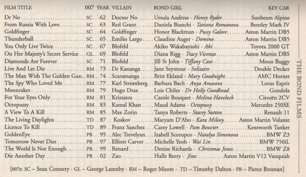 Bond Films, Portrayers, Years, Villains, Girls, and Cars. Everybody remembers the Aston Martin DB5, Sean Connery’s Goldfinger and Thunderball ride with Pussy Galore and Domino, respectively, but what about his Sunbeam Alpine and Honey Ryder? Or Pierce Brosnan’s BMW Z3 and Christmas Jones? (Sorry, Ben, about Timothy Dalton’s Kentworth [sic] Tanker.)