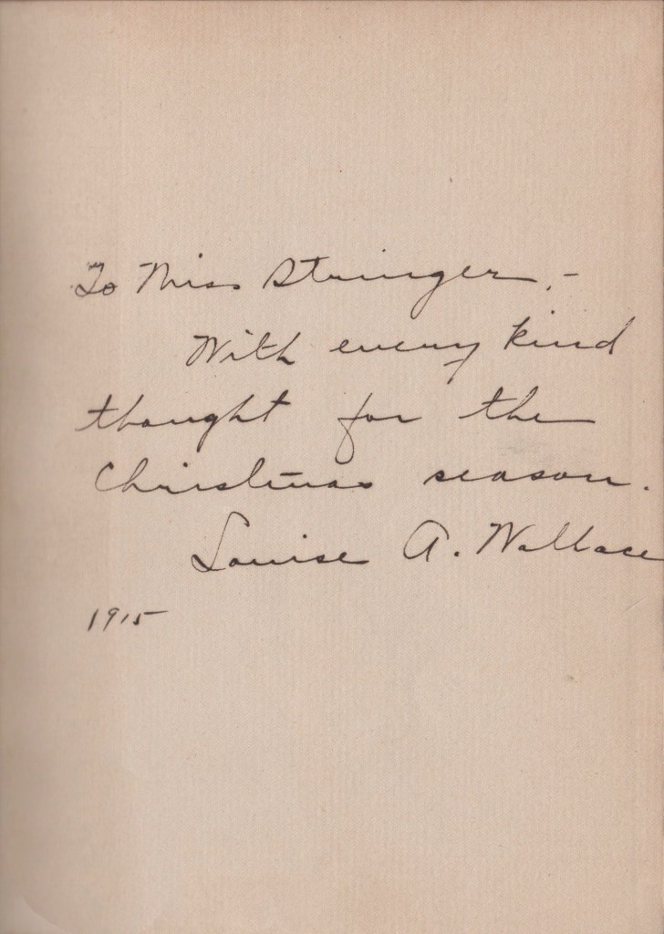 This book has had classic reprints and the like. My edition is a rare original, indeed, inscribed to a Miss Stringer—“With every kind thought for the Christmas season. Louise A. Wallace 1915”