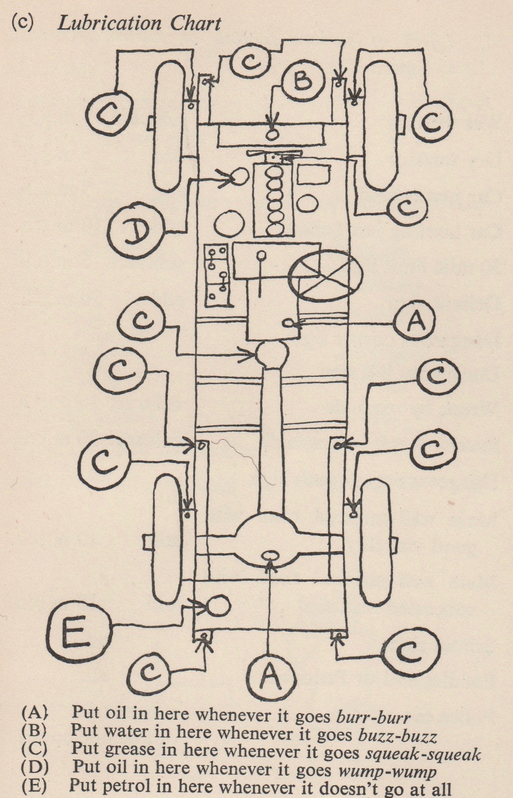 Oil Gauge. “This is a little clock with ‘Pounds per square inch’ on its face. It has only one hand, which moons vaguely about. A sudden return to zero can mean a hundred different things to the expert, but never more than one to the beginner, who won’t have noticed anything anyway.”