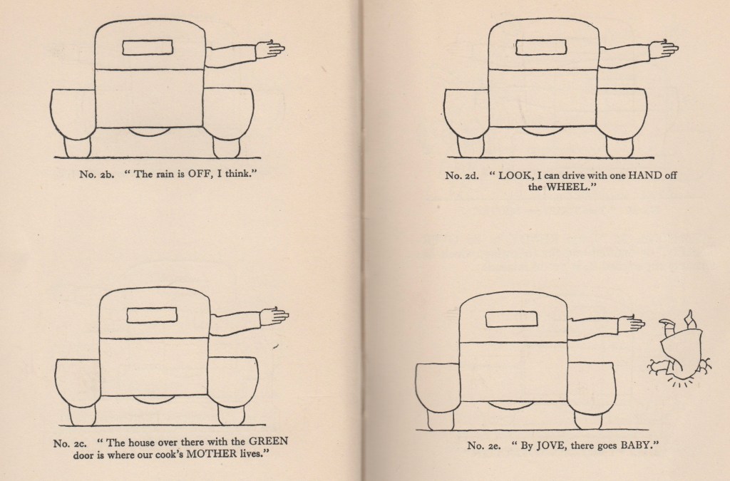 Rev. Counter. “This, in spite of its name, is a purely secular instrument. It tells you how fast your engine is going, and, if you watch it carefully enough, you can change gear absolutely noiselessly—apart from the tinkling of glass as you drive through a shop window in the process.”