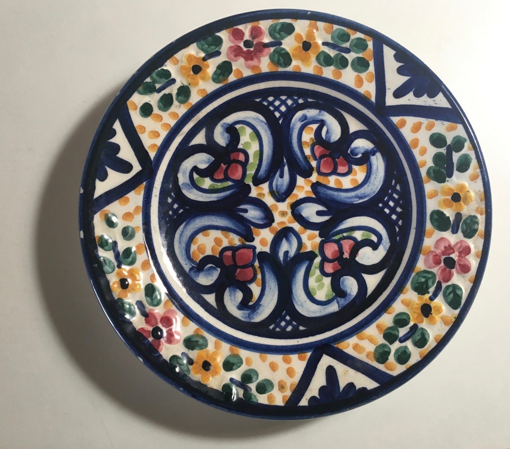 This plate, purchased in Spain, has its manufacturer’s name embossed on the bottom as well as its artist identified by a painted signature.