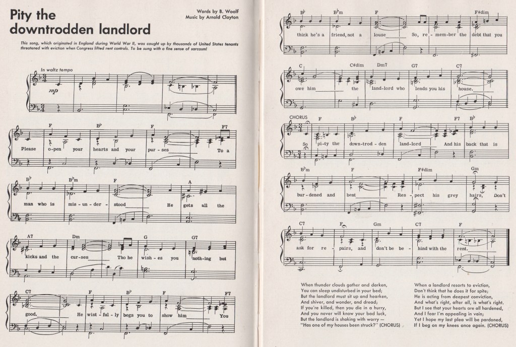 Turn on the Sarcasm. Pity the Downtrodden Landlord originated in England during World War II. It became the song of “thousands of United States tenants threatened with eviction when Congress lifted rent controls. To be sung with a fine sense of sarcasm!” notes The People’s Song Book.