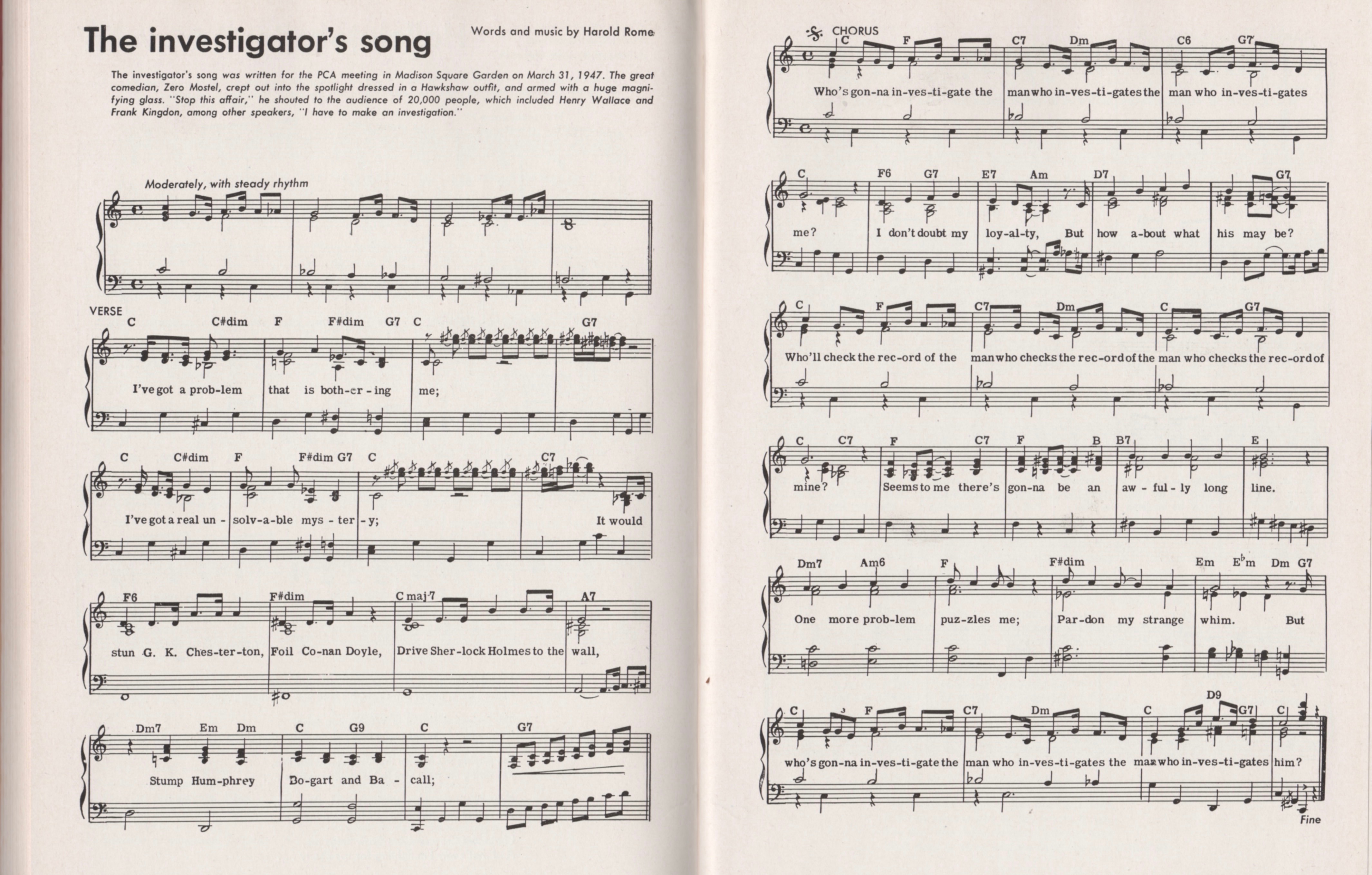 Are You Listening, J. Edgar Hoover and Joe McCarthy? “The Investigator’s Song was written for a PCA meeting in Madison Square Garden on March 31, 1947.” Wikipedia notes, “The Progressive Citizens of America (PCA) was a social-democratic and democratic socialist American political political organization formed in December 1946 that advocated progressive policies, which worked with the Congress of Industrial Organizations (CIO) and allegedly the Communist Party USA (CPUSA), as a precursor to the 1948 incarnation of the Progressive Party.”