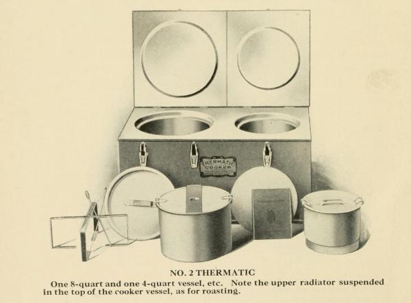 A 1910 Department of Agriculture lecture described, “The cooking box is by no means a new invention, for the principle on which it is built, namely, protecting a hot article so it will keep hot for a long time, has been applied for countless years. For generations Norwegian peasants, among whom the whole family goes to the fields to work, have been in the habit of using so-called hay boxes in which their dinners cook during their absence. It is said that in Germany working people sometimes start their soup on the stove and then leave it between feather beds to finish cooking. Cooks in Maine lumber camps bury their bean pots in ‘bean holes’ in hot embers and ashes and leave them to bake during the day. The ‘clam bakes,’ so popular among our Atlantic coast, represent the same kind of cooking under other conditions.”