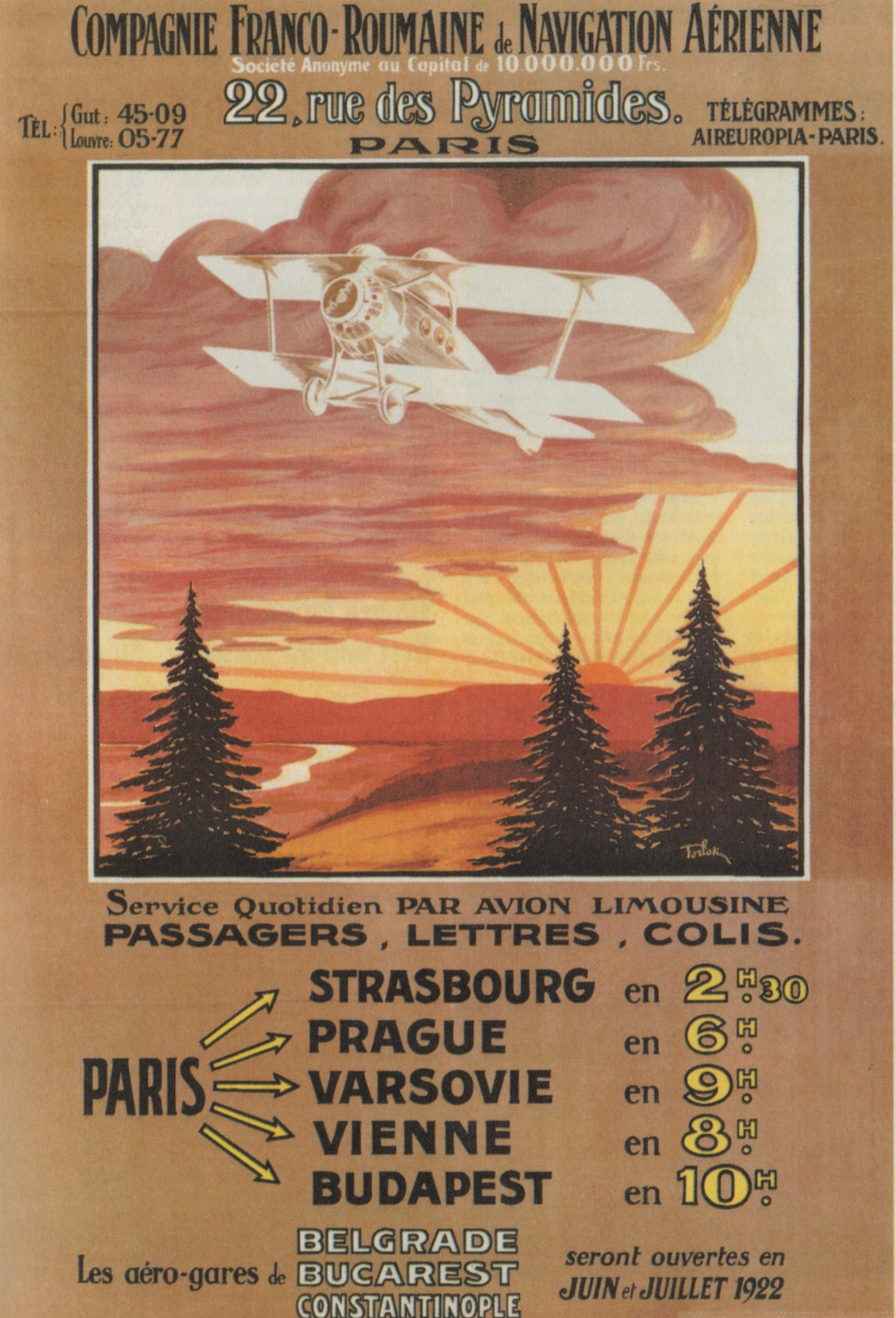 Paris and East. The Compagnie Franco-Roumaine de Navigation Aérienne was founded on January 1, 1920, making it the world’s first transcontinental airline. The U.S. didn’t have a transcontinental carrier (albeit over a considerably larger transcontinent) until 1928 with TAT. Wikipedia notes that CFRNA also made the first passenger international night flight, between Belgrade and Bucharest in 1923.