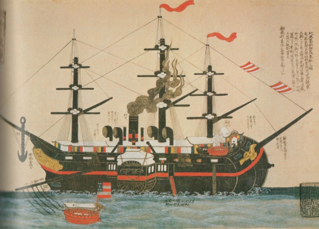 Wheels From the West. Commodore Matthew Perry’s Black Ships entering Edo Bay in 1853 were “smoke-belching vessels propelled by huge exterior paddle wheels,” the first steamships seen by the Japanese, noted Mitsukuni.