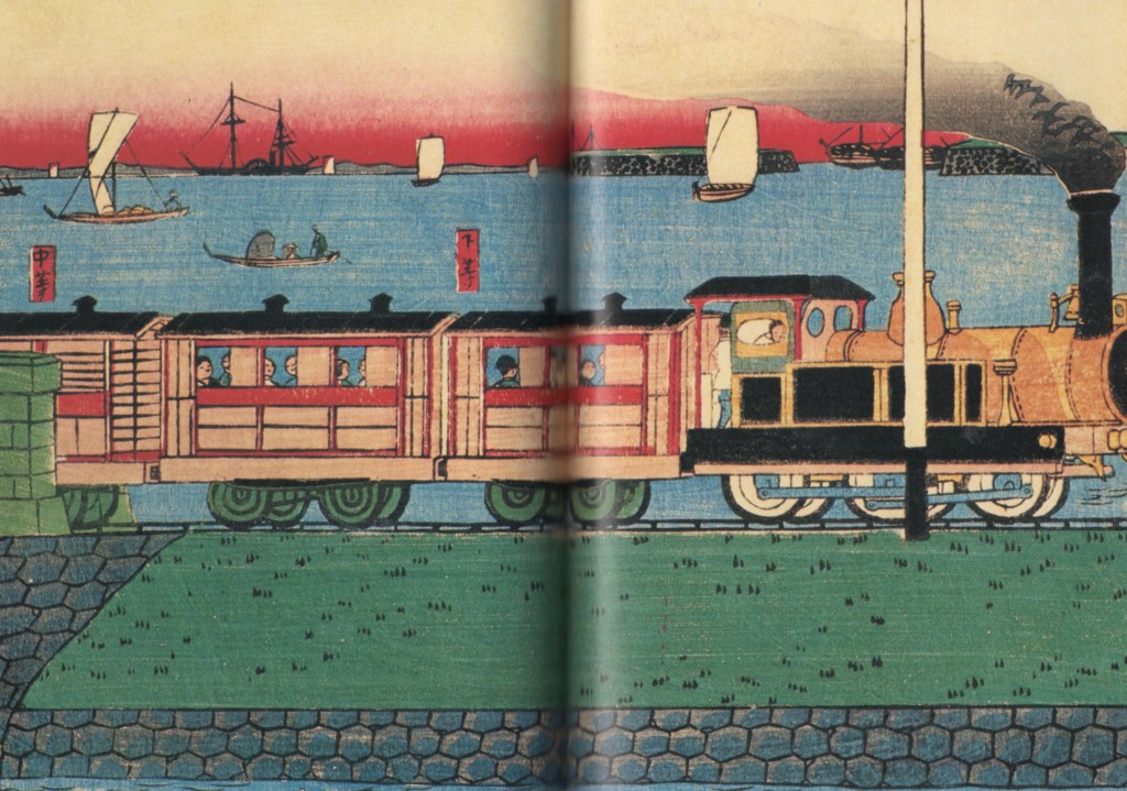 The Meiji Era was a period of adopting Western ways, including wheeled travel. The first Japanese railway, imported from England, was completed in 1872. It made the 18-mile trip from Shimbashi [in central Tokyo] to Yokohama in about 53 minutes.