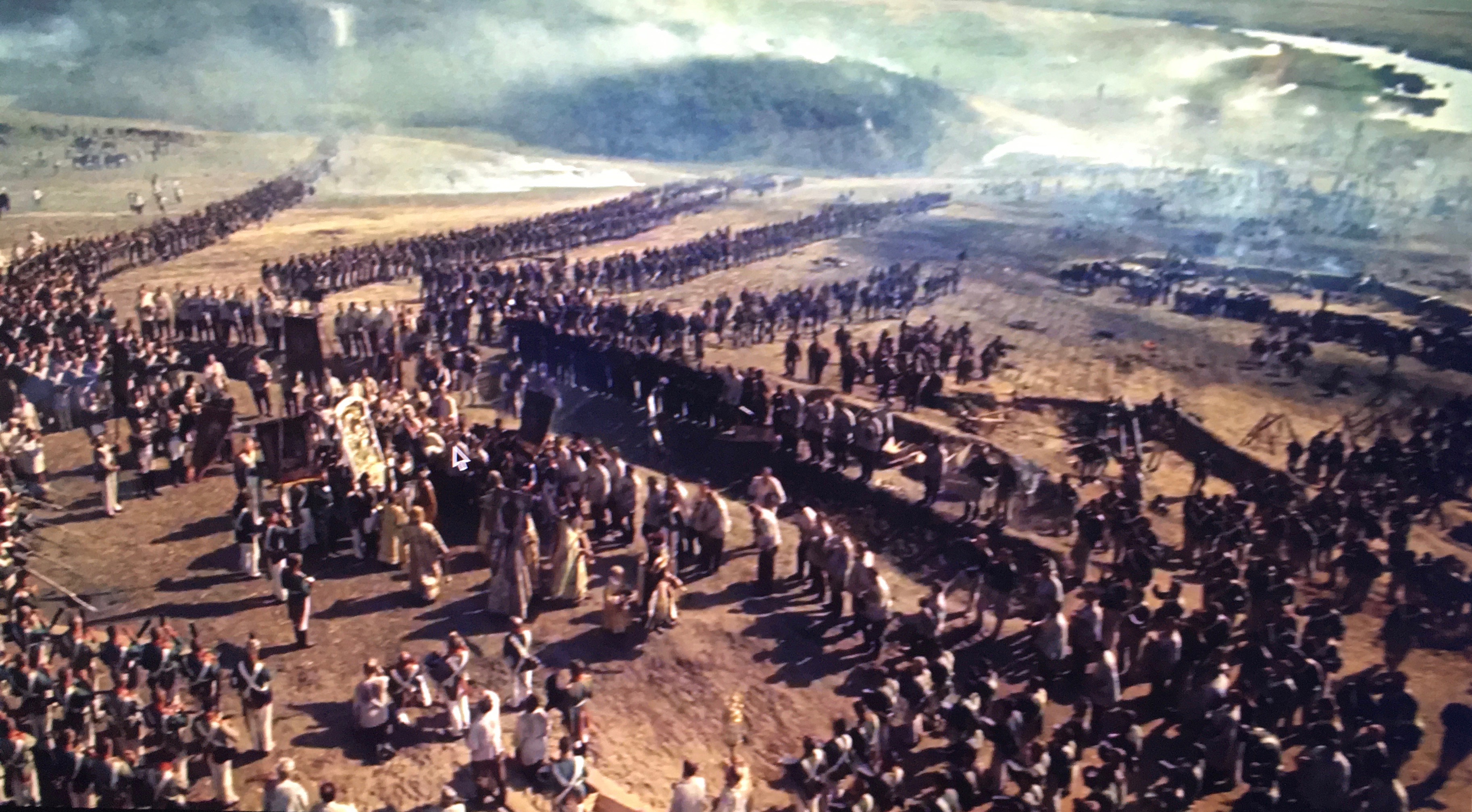 As an example, Wikipedia reports that filming the Battle of Borodino (in Part III of the four-part epic) involved “23 tons of gunpowder, handled by 120 sappers, and 40,000 liters of kerosene were used for the pyrotechnics, as well as 10,000 smoke grenades…. The set was divided to sectors, and a system of loudspeakers was installed – one for each area – to enable the director to coordinate the troops’ movements.”