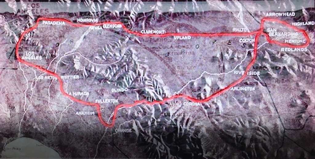 Black described, “It takes in Pasadena, Santa Anita, Upland, San Bernardino, Redlands (here a drive can be taken to Smiley Heights and Prospect Park); returning from Redlands the route is via Mentone, Highlands and San Bernardino to Riverside, and thence to Casa Blanca, Corona, Orange, Anaheim, La Mirada and Redondo Junction.”