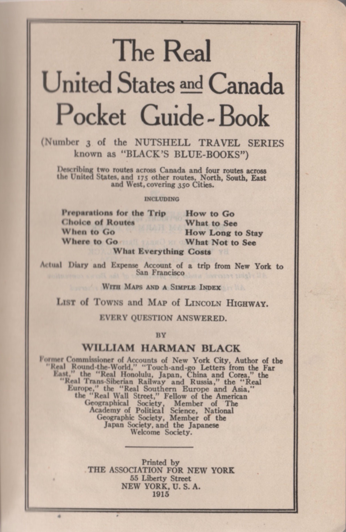 IT’S A RATHER IMPOSING title for a 1915 pocket guide: The Real United States & Canada Guide-Book. But its author William Harman Black had already published Real Round the World, Touch-and-go Letters from the Far East, the Real Honolulu, Japan, China and Corea, the Real Trans-Siberian Railway and Russia, the Real Europe, the Real Southern Europe and Asia, and the Real Wall Street. It’s quite amazing that he had also served as Commissioner of Accounts for New York City.