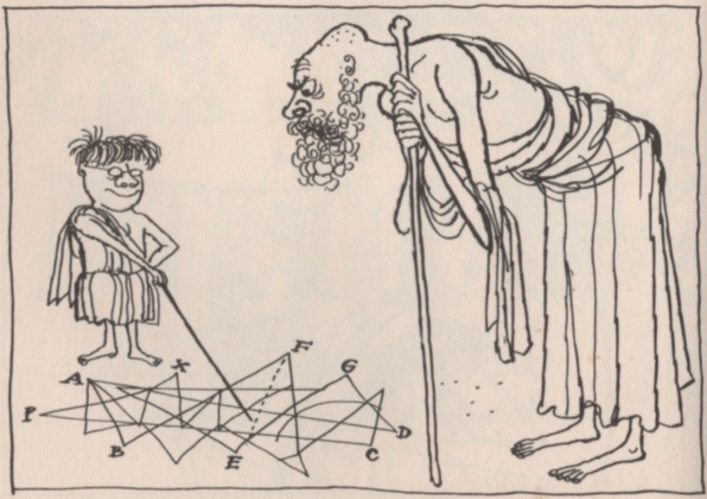 “To do geom,” Molesworth explains, “you hav to make a lot of things equal to each other when you can see perfectly well that they don’t. This agane is due to Pythagoras and it formed much of his conversation at brekfast.”