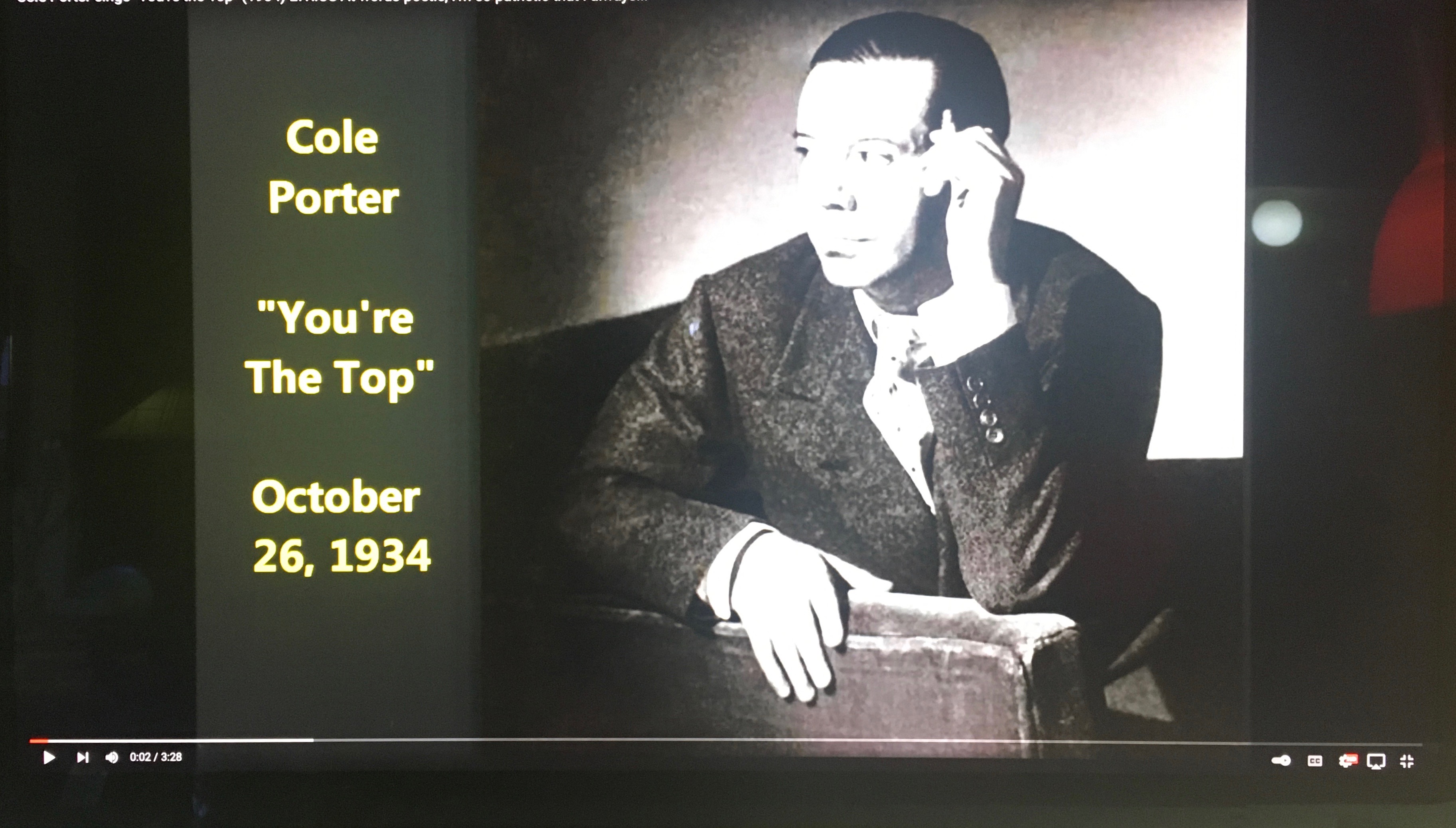 You’re the Top! This standard by Cole Porter and John McGlinn was the hit of the 1934 musical Anything Goes. It too is filled with feminine rhymes incorporating its contrasting similes: “You’re the top,/ You’re Mahatma Gandhi./ You’re the top,/ You’re Napolean brandy./ You’re the purple light/ Of a summer night in Spain./ You’re the National Gallery,/ You’re Garbo’s salary,/ You’re cellophane.”
