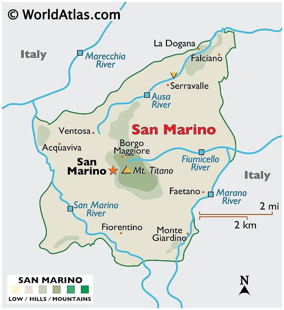 San Marino. Surrounded completely in Italy’s northeast, San Marino is the fifth smallest country on Earth. WorldAtlas notes, “San Marino is the world’s oldest republic. According to tradition, it was founded in 301 CE by Marinus, a Christian stonemason seeking refuge from religious persecution on Mt. Titano. San Marino was never part of any larger state, and has always been governed separately.”