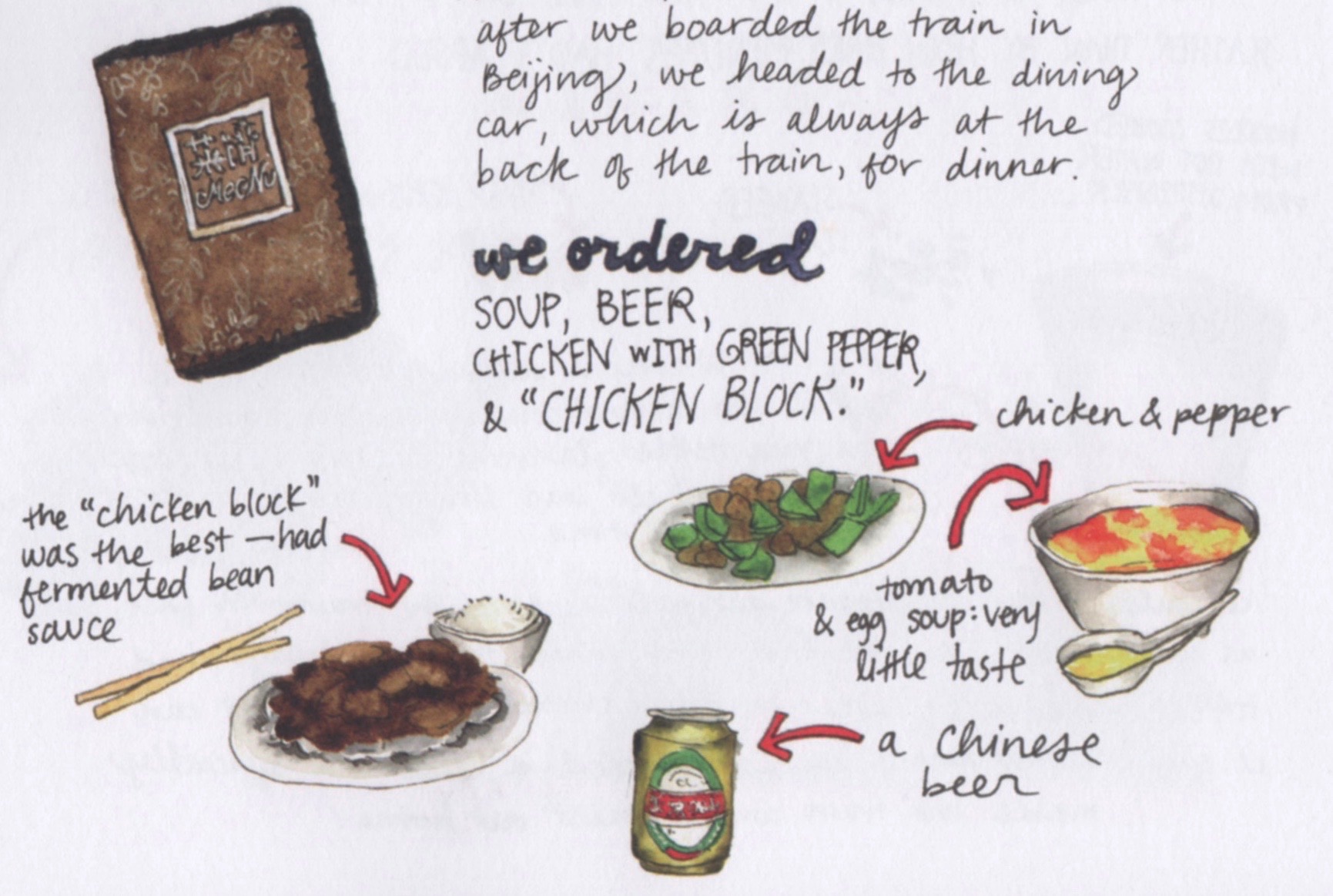 Chinese Chicken Block. Naturally enough, “The food served in the dining cars corresponds with—& changes according to—the country you’re in.”