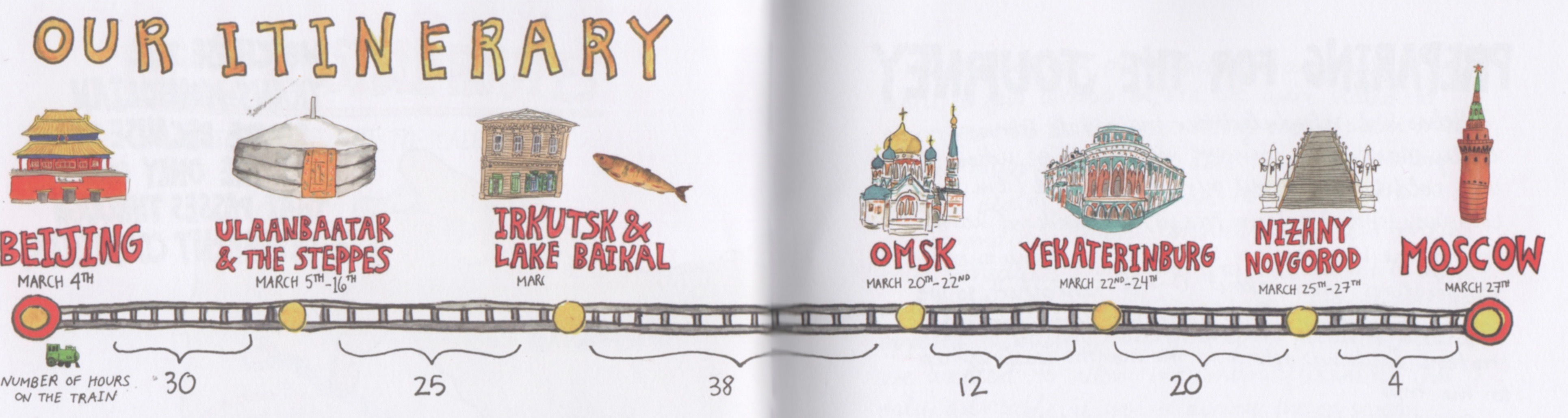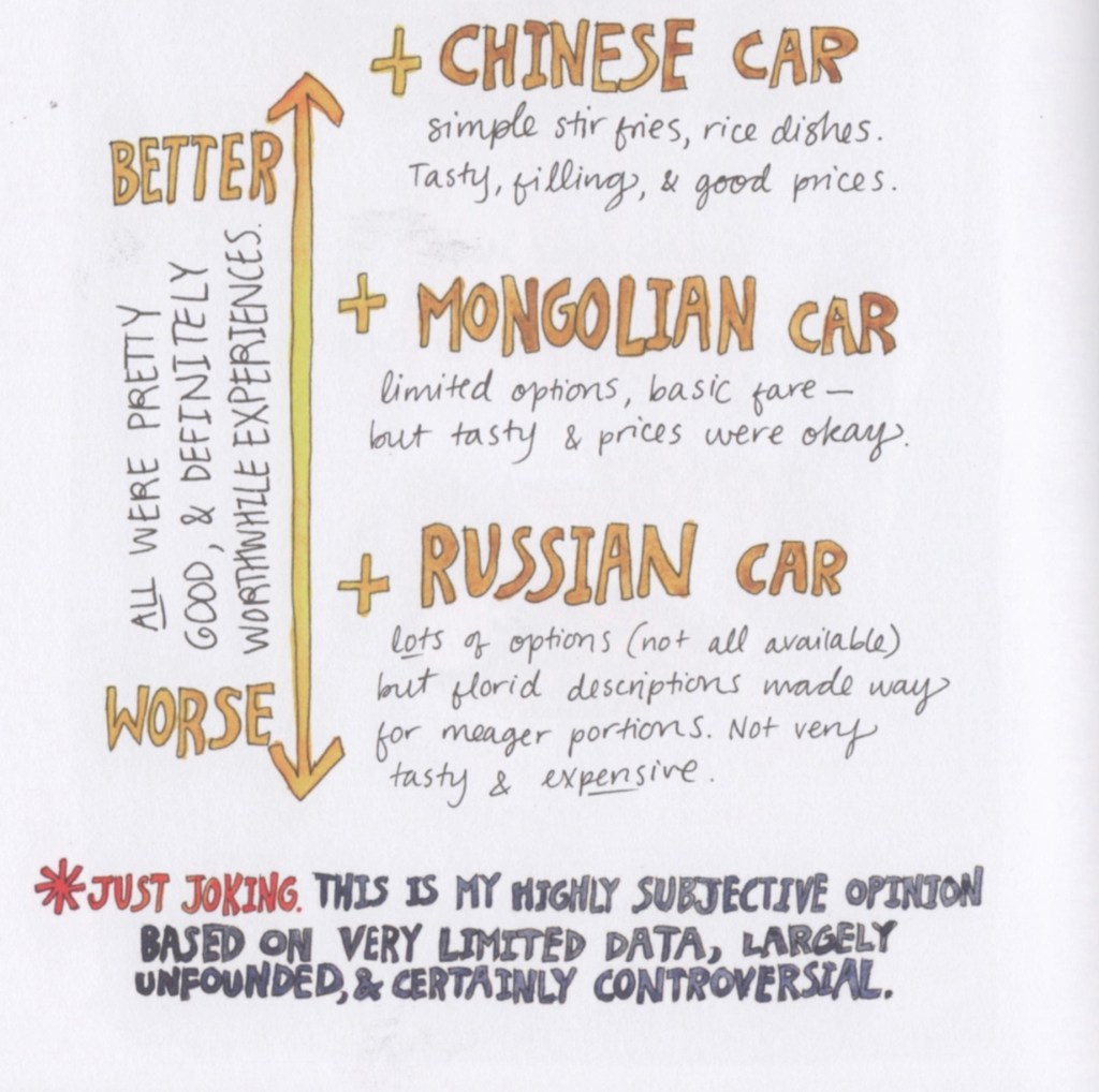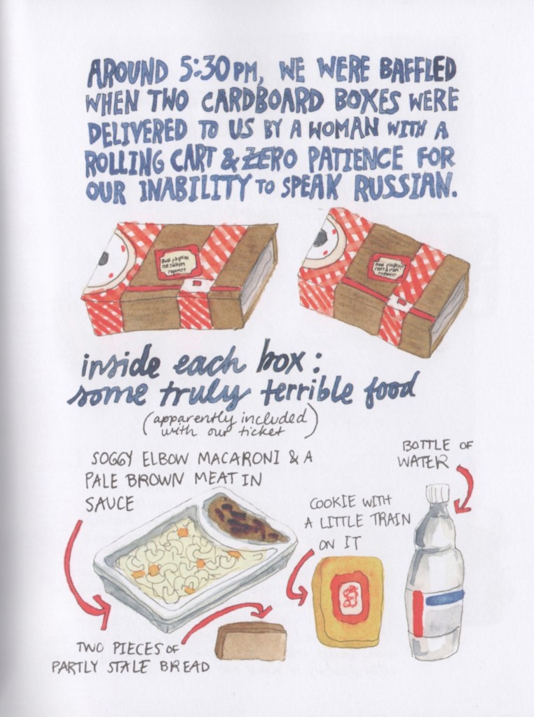 Emma offers (and illustrates) hints on preparing for and undertaking the trip, for example, “Upper vs Lower Berths & Common Train Courtesy.” Here I focus on one aspect, the culinary adventures.