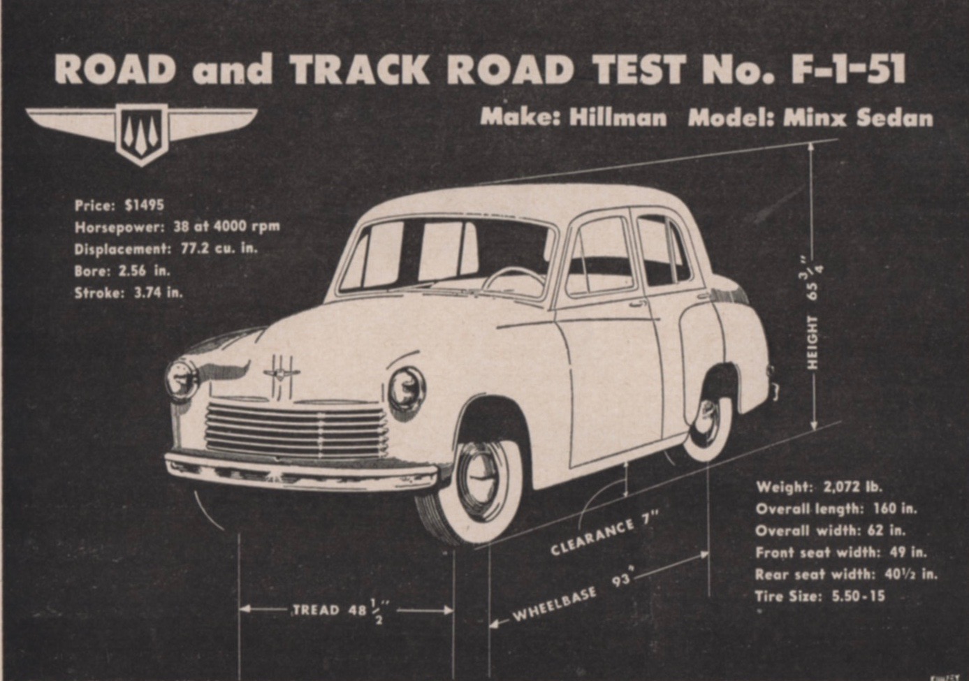 Road Test No. F-1-51. Road and Track opened this first road test with “When taking over the wheel of the Hillman 4-door sedan, in its latest Mark IV form, we tried to evaluate the car in a manner similar to the approach of an average American motorist.”