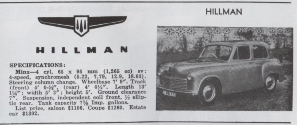 The Hillman. Of the Hillman, Barlow said, “Altho now a part of the famous Rootes Group, the Hillman car came into being in 1907 and the firm has always specialized in small cars of excellent quality. The now famous ‘Minx’ was first introduced more than 15 years ago and has undergone continuous development during this period.”