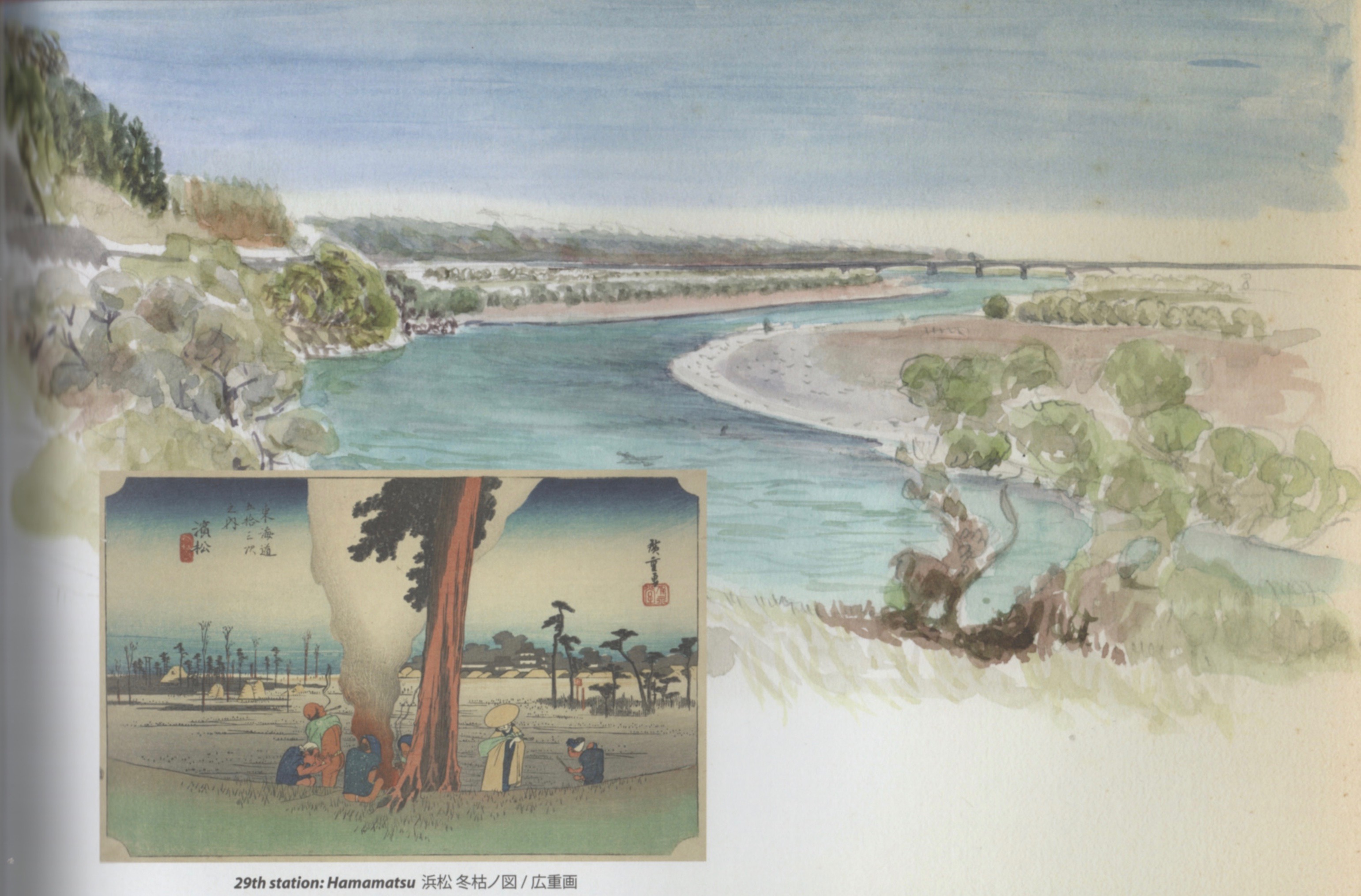 Hamamatsu. Philippe describes Hiroshige’s 29th station: Hamamatsu: “The foreground resembles a stage set, with all the main characters assembled around a solitary pine, where they’ve made a fire…. Despite the houses that can be seen nestling against the castle in the background, the rest of the landscape is devoid of human presence, and the almost-monochrome color scheme gives a sad and desolate air to this portrait of chilly winter on Hamamatsu plain.”