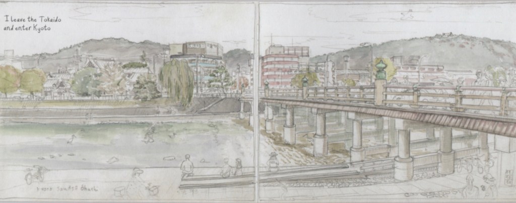 Kyoto. Philippe writes, “Travelers finally enter the imperial city by the Sanjo Ohashi Bridge across the Kamo River.”