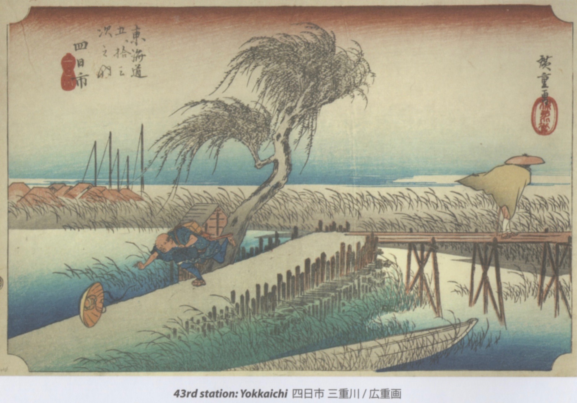 Yokkaichi. Philippe describes, “Reed fields stretch across the Mie River and hide the maritime horizon…. Upon this sad fall landscape, Hiroshige calls forth a sudden gust of wind, with an ironic nod to the old joke of the hat that blows away.”
