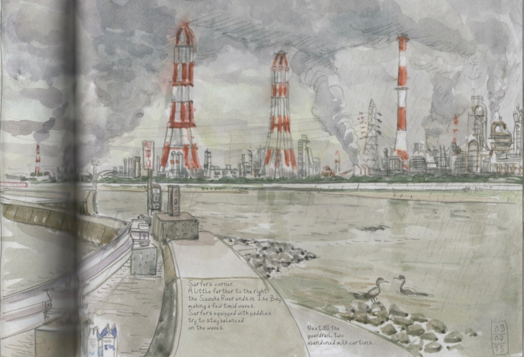 “After World War II,” Philippe writes, “Yokkaichi became an important petrochemical hub. All along the Suzuka River estuary, chimneys threw up a dense cloud of pollution. But surfers are not discouraged even though the waves in Ise Bay are mediocre at best.”