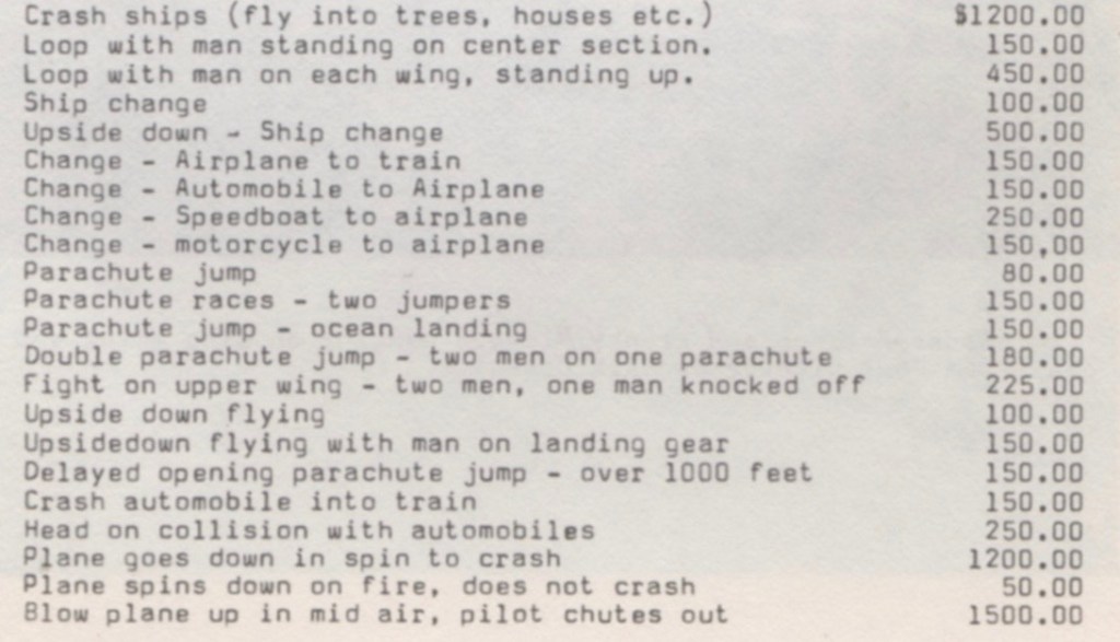 Unlike their competitors, the Thirteen Black Cats provided filmmakers with a list of stunts and prices, including “all equipment necessary for the stunt with the exception of the trains.”