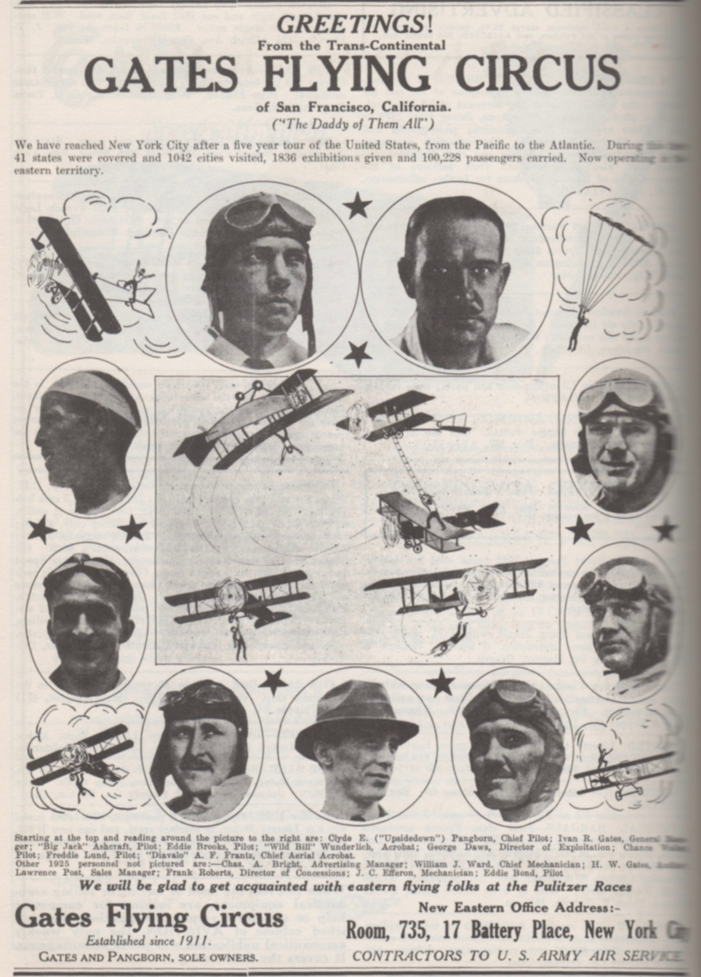 After a five-year national tour, the Circus set up a New York City branch as contractors to the U.S. Army Air Service. The Aeroplane Scrap Book noted “The Gates Flying Circus was the largest and best known of all the exhibition groups. Many pilots of later fame flew with the Gates Circus.”