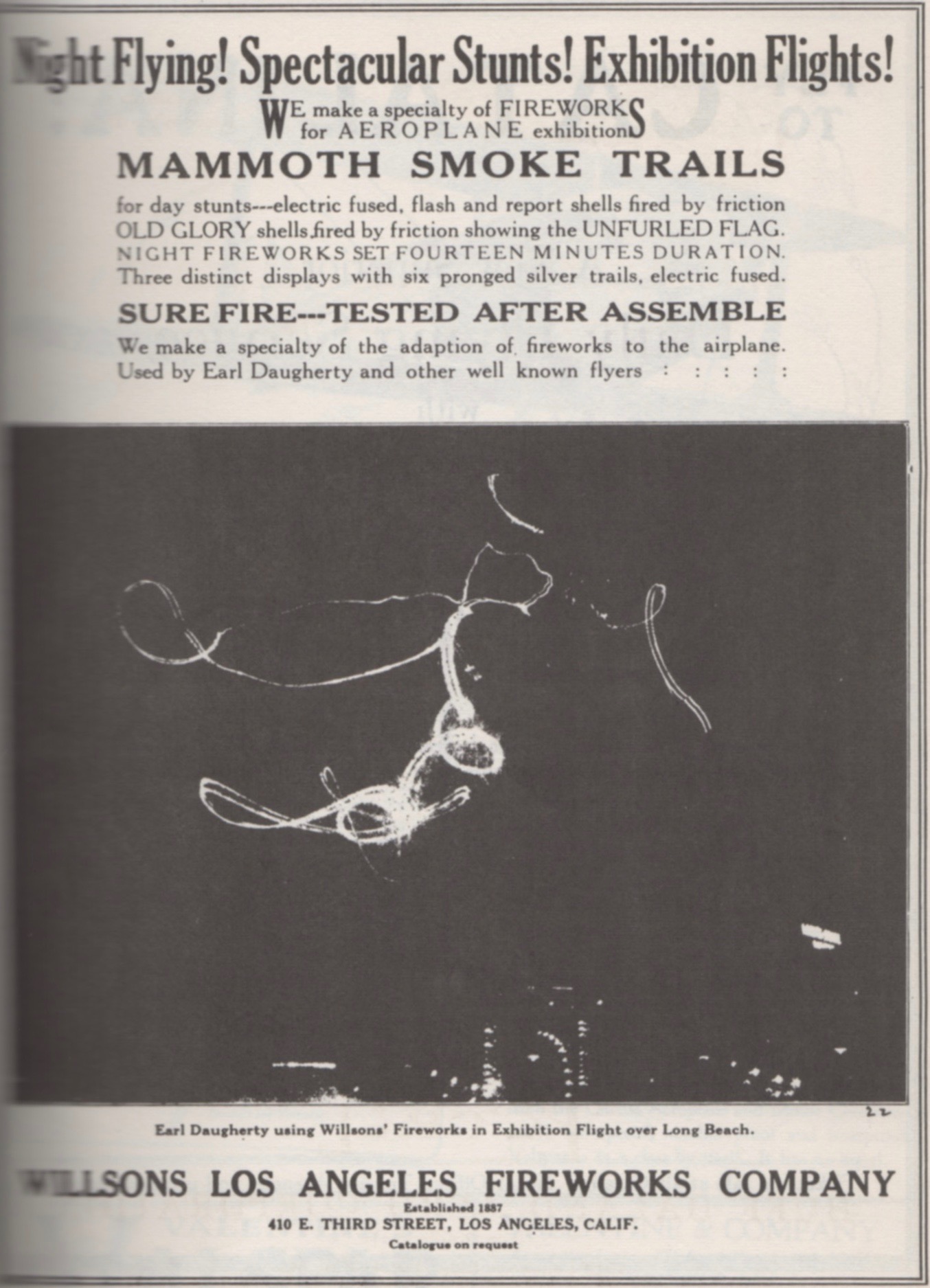 Night Entertainment. The Willsons Los Angeles Fireworks Company was established in 1887, and by 1922 it was promoting “a specialty of FIREWORKS for AEROPLANE exhibitions.”