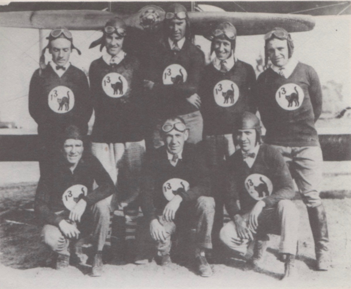 Thirteen Black Cats. Challenging triskaidekaphobia as well as black felines, a group of pilots formed Thirteen Black Cats in 1925 specifically for exhibitions and stunt work in motion pictures. Los Angeles Aeronautics noted, “One requirement for membership was that the member’s name must contain 13 letters.” If a given name didn’t work, a newly invented nickname would suffice: for example, “Fronty” Nichols, “Spider” Matlock, and the organization’s president “Bon” MacDougall.