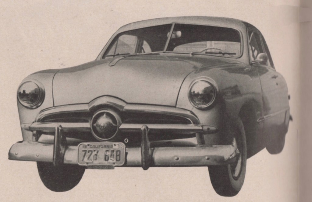 One of the engineers was on loan from Convair Ft. Worth, and he had a housing/transportation allowance. Instead of renting a car, he bought a used base model ’49 Ford business coupe with the flathead V8 and three on the tree. When he went back to TX, he felt it would be unethical (strange attitudes back then) to sell it as he had already been paid via his allowance. So, taking pity on my sweaty bike ride, he gave it to me.