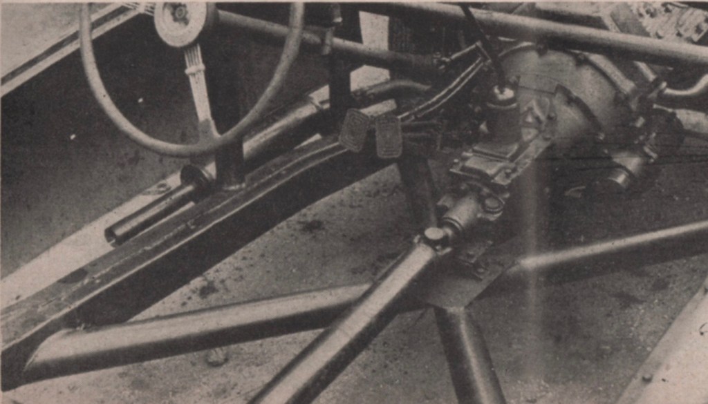 Steering. John detailed, “Steering has been speeded up to three turns from lock to lock by using a 1934 Ford steering gear coupled to a 1936 Cadillac universal jointed steering column. This actual assembly was illustrated in Road and Track for October 1951 (page 32). The 1950 Ford pitman arm is used and a fabricated steering gear mounting bracket places this arm at the same location as on the stock 1950 car. Thus, there is no change in steering geometry.”
