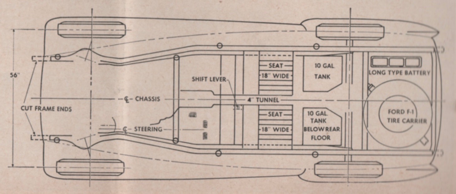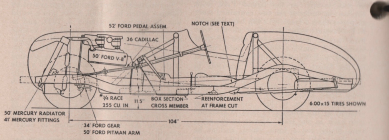 Ford Chassis. “The frame,” John wrote, “was sawed in two and a 10” section removed to give a wheelbase of 104”. The modified Ford V-8 engine has been relocated 18” aft of the stock position and this necessitated new motor mounts both front and rear.”