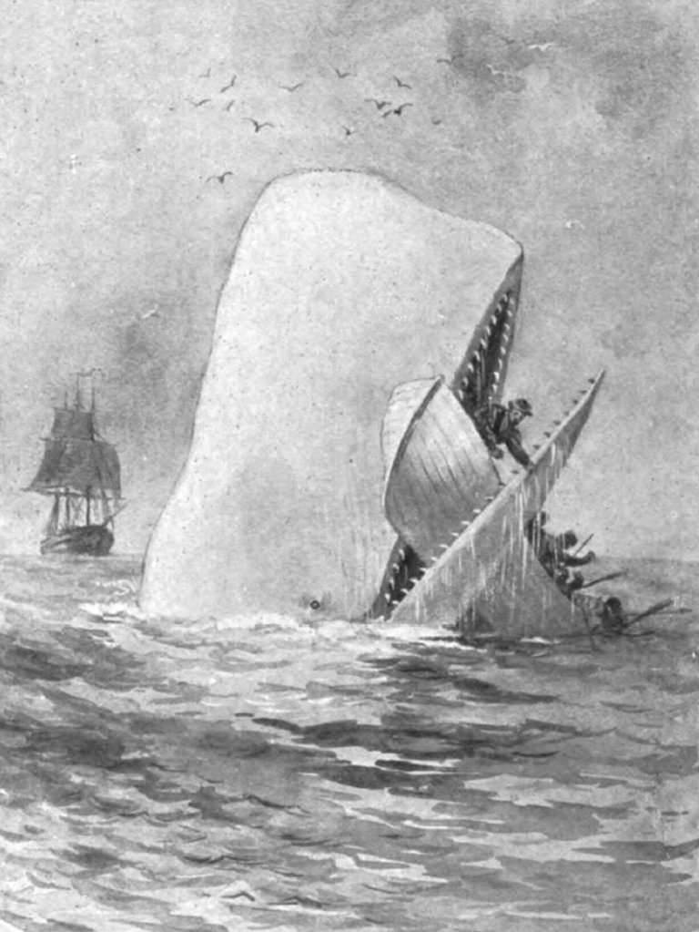 Moby Dick is encountered, and anyone who knows the story is ready for Ahab fighting the whale to a mutual demise. Sure enough, he harpoons and mounts the vast cetacean for the kill.
