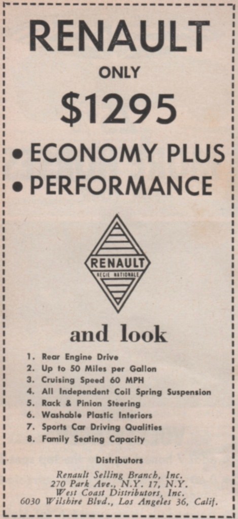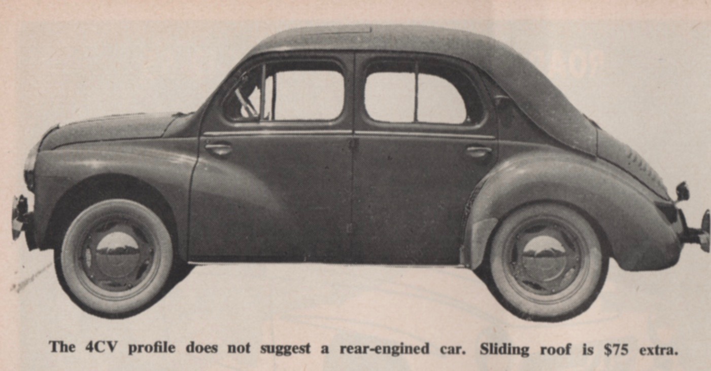 “Light, Cheap and Sprightly” read R&T. It continued, “Any attempt at evaluating the Renault 4CV should begin with the price, for here is one of the cheapest automobiles in the world; $1195 on the east coast and $100 more in the west.”