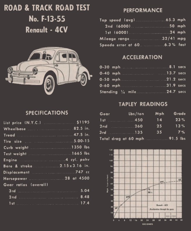 “A second impression of the Renault is the astounding performance,” R&T (possibly over-) enthused. “Bear in mind that this engine displaces only 747 cc and that there are only 3 forward speeds. Yet the 4CV accelerates to 60 mph nearly as quickly as a very popular competitor having 1192 cc.”