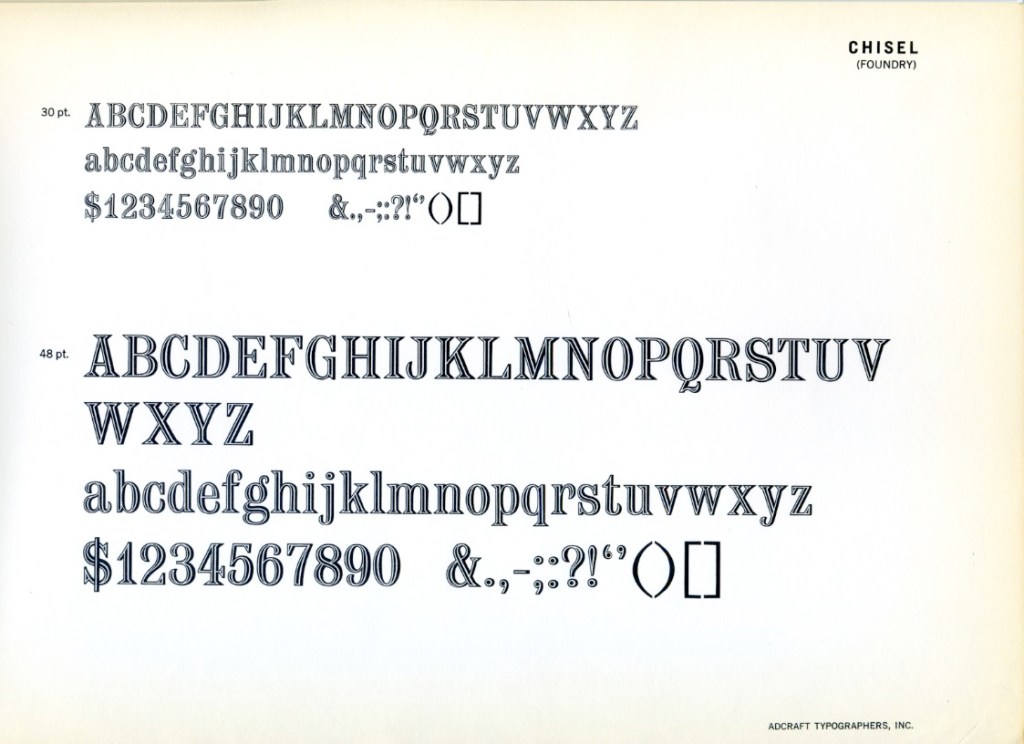 Other Typefaces. In 1939,Harling devised Tea Chest, a stencil design inspired by old boxes and industry. Also that year, he designed Chisel, an adaptation of a ‘Latin’ or wedge-serif face.