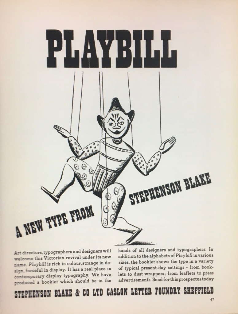 A Typographical Bent. Or happier when designing new fonts: Playbill is his most well known typographical effort, designed in 1938 for Stephenson Blake, a highly regarded type founder established in 1818.