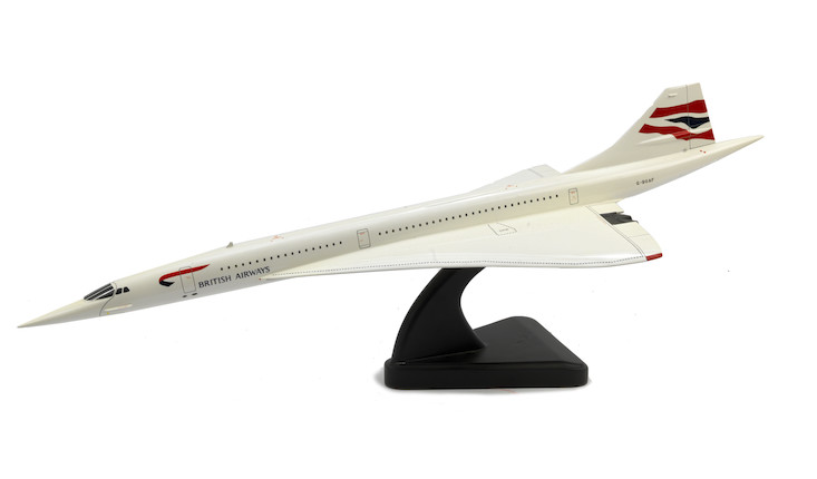 British Airways Concorde. For instance, on Friday, September 9, a scale model of British Airways Concorde G-BOAF went for £573.75 including premium (about $666 U.S.). It was described as “approximately 1:72 scale, believed by Bravo Delta, carved mahogany with hand-painted finish.” Not just a little book shelf model, this one was listed at 91 cm (35.8 in.) long.