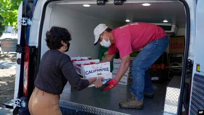 Two workers load boxes of produce for donation at Food Shift, a nonprofit in Alameda, California, that collects unwanted groceries and distributes them to the needy.