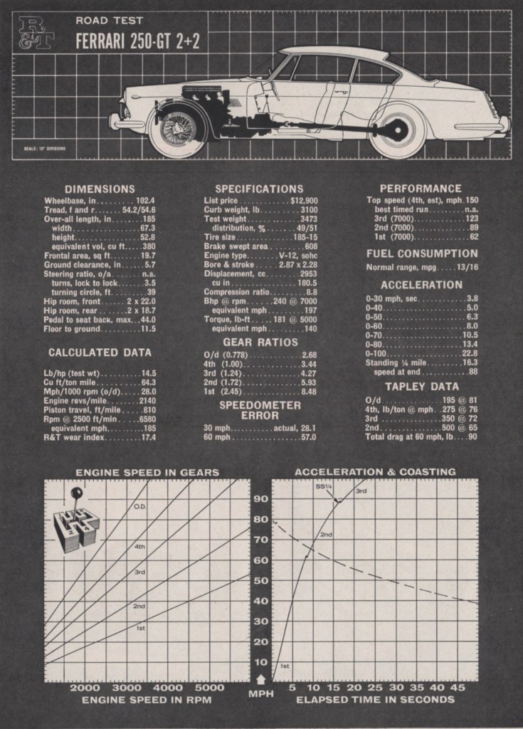 R&T observed, “The 250/GT Ferraris are among the most docile and, surprisingly, uncomplicated automobiles in the world. Smooth acceleration is possible even when applying full throttle in top gear at 10 mph.”