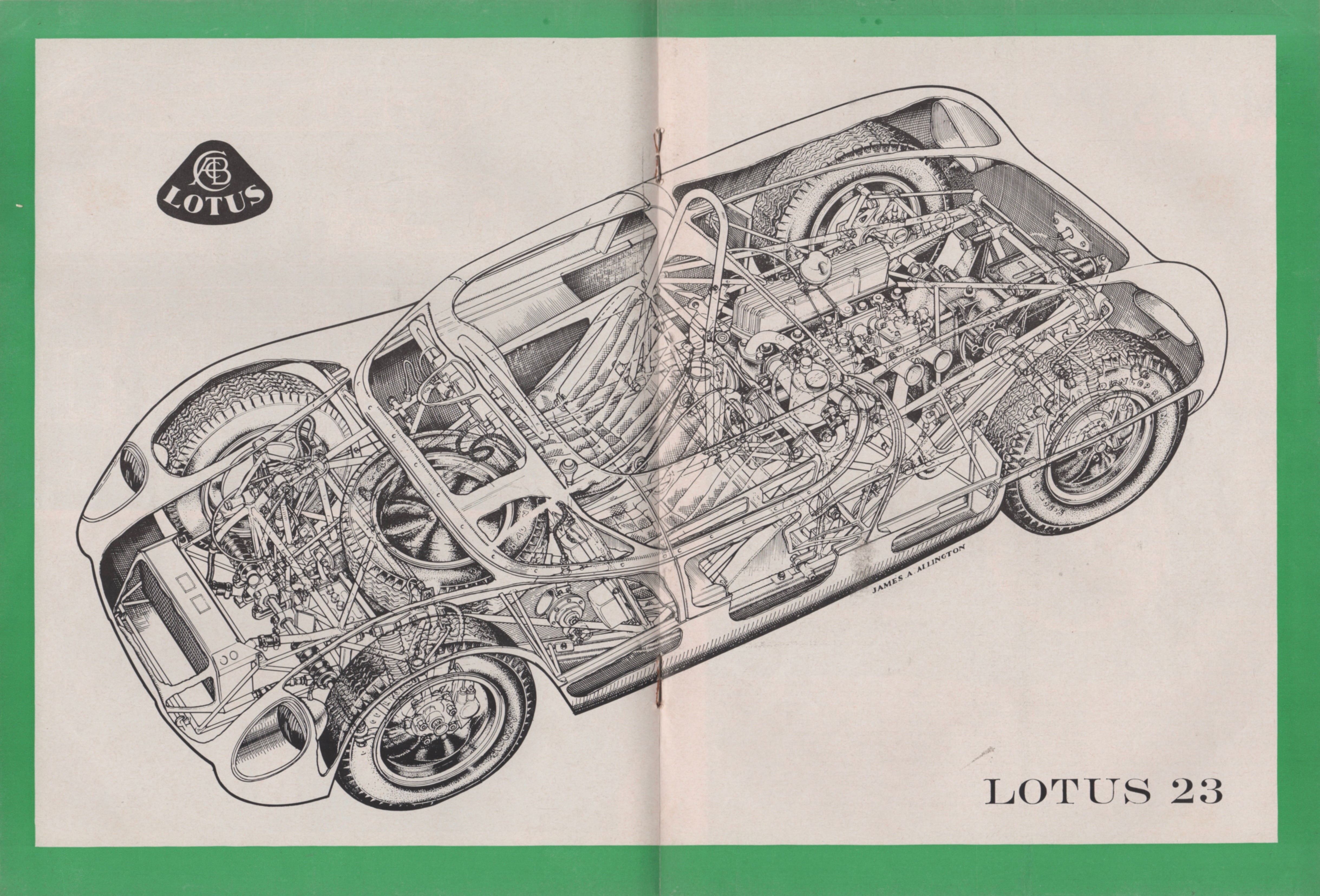 The 23’s Heritage. David Phipps observed, “In 1960, Lotus produced the Nineteen, or Monte Carlo, a sports version of the 1960 Formula One car. Now comes the 23, a 2-seater based on the all-conquering 1961 Formula Junior Lotus and incorporating most of the modifications found in the 1962 model.”