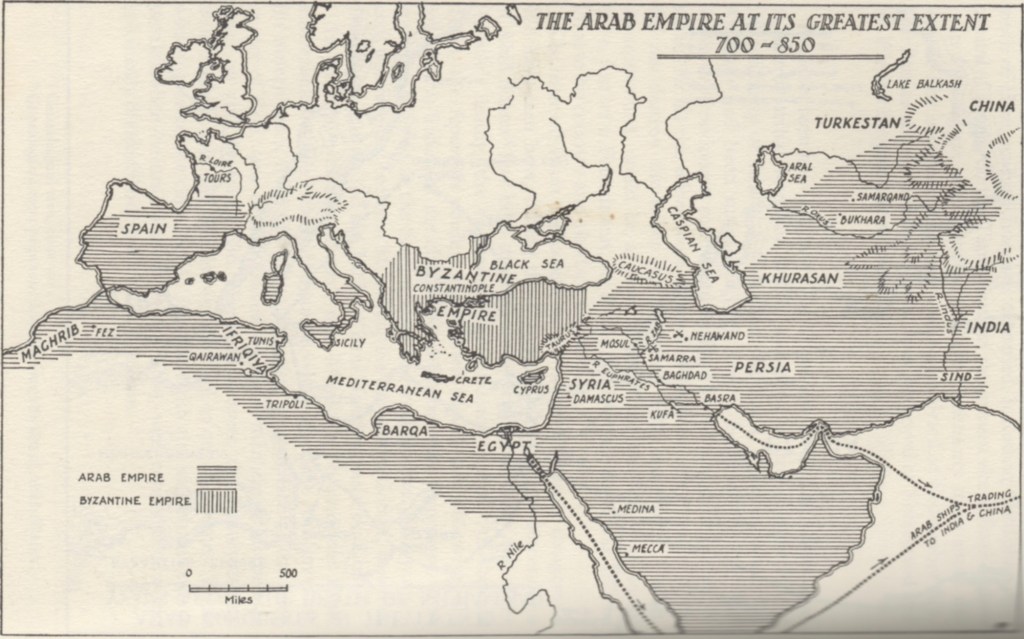 “By 712,” Glubb says, “the Arabs had reached the frontier of China north of Tibet, and occupied what is now West Pakistan. They reached their maximum expansion to the West in 732, when they were defeated at Tours, in Central France, only 250 miles from Dover.”